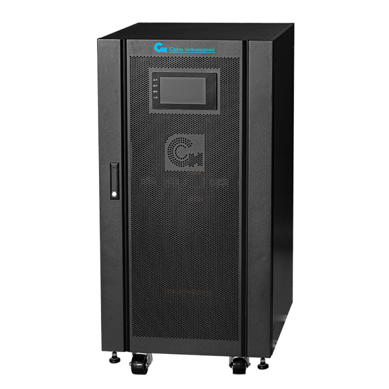 Трёхфазный Online источник бесперебойного питания СИП380А40БА.10-33/4АГ выпускается в России, 3 фазы на входе на выходе, мощность устройства составляет 40 кВА \ 40 кВт. Высокий коэффициент выходной мощности = 1 обусловлен топологией двойного преобразования. Это обеспечивает не только эффективную работу ИБП, но и абсолютную защиту питаемого оборудования от любых проблем с электропитанием. Для повышения отказоустойчивости СИП380А40БА.10-33/4АГ предусмотрен раздельный байпас, также бесперебойник хорошо выдерживает перегрузки. Трёхфазный источник бесперебойного питания работает от внутренних батарейных блоков, которые заряжаются мощным зарядным устройством, оно подаёт ток до 20 А. Компактный корпус выполнен в башенном форм-факторе, что позволяет установить ИБП даже в небольшом помещении. Уровень шума от системы активного охлаждения не превышает 64 дБ. На передней панели установлен сенсорный цветной ЖК дисплей с русским интерфейсом, с помощью него можно отслеживать состояние СИП380А40БА.10-33/4АГ и настраивать его режим работы. На задней панели находится клеммная колодка и слоты SNMP, USB, Modbus, dry contact, RS-232 и EPO.